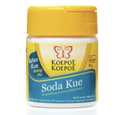Koepoe Soda Kue Pengembang Natirum Bikarbonat Kemasan : 81gr Soda Kue Koepoe Koepoe digunakan untuk mengembangkan berbagai macam adonan kue, bolu, biskuit dan martabak. Dibuat dari bahan pilihan yang bermutu tinggi untuk kesempurnaan kue anda. Keunggulan (unique selling point): 1. Terbuat dari bahan khusus yang berkualitas untuk aneka masakan, kue, roti, maupun biskuit sejak tahun 1942 2. Kualitas ekspor dan sudah diterima di berbagai negara dengan standar pangan ketat 3. Sertifikasi BPOM, HALAL, ISO 22000 dan HACCP 4. Memenuhi standar GMP 5. Kemasan yang praktis dalam penggunaan 6. Tanpa pengawet